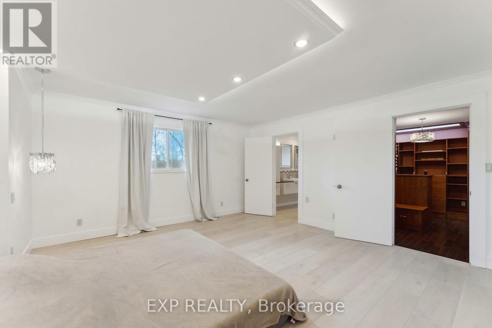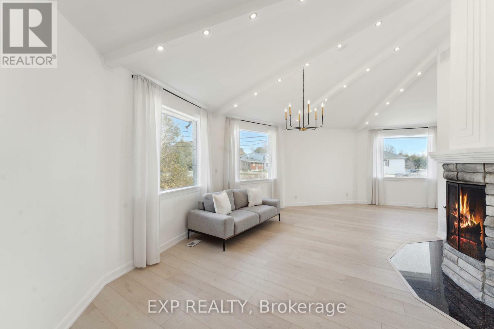 This exceptional custom-designed bungalow situated on Bank Street showcases high-end finishes and remarkable versatility, all set on a beautifully landscaped private acre. The homes distinctive circular layout is filled with natural light, thoughtfully connecting the living, dining, and kitchen areas around a striking multi-sided fireplace accented with granite, fostering a cozy and welcoming atmosphere. Elegant marble tile graces the foyer and hallway, lending an air of classic sophistication. The expansive kitchen is a culinary and entertaining haven, featuring stainless steel appliances, granite countertops, and abundant custom solid wood cabinetry that combines practicality with refined style. The lavish primary suite provides a peaceful sanctuary, complete with a spacious five-piece ensuite that includes a spa-inspired soaker tub, a glass-enclosed shower, a large double vanity, and a walk-in closet outfitted with custom shelving and organizers. Additional well-appointed bedrooms, upgraded bathrooms with heated flooring, and the convenience of main-floor laundry enhance the homes appeal. A separate entrance leads to the basement, where pre-installed plumbing offers the potential for a secondary suite or customized living space. This residence perfectly balances sophistication, comfort, and endless possibilities. Book your private tour today! Freshly painted, LVF flooring, Eavestroughs and landscaping (2024) (id:52884)